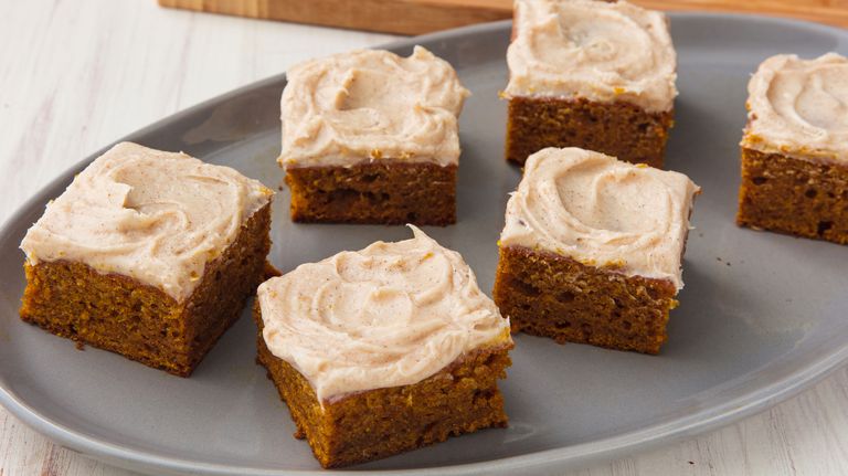 - 2. In a separate large bowl, whisk together eggs, oil, sugars, and pumpkin. Add dry ingredients to wet ingredients and stir until just combined. Pour batter into prepared baking sheet and bake until a toothpick inserted into the middle comes out clean, about 30-35 minutes. Let cool.